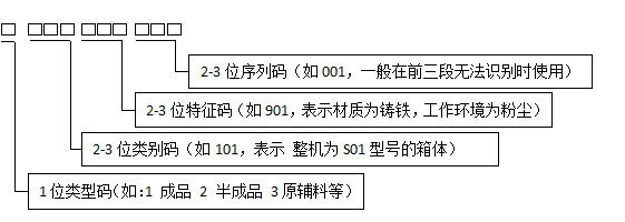 物料编码是物料的唯一识别代码,新物料的物料编码必须有专人来编写,避免重复,物料编码的长度不要太长,一般控制在13位以下比较好,可以定长度或不定长度,下面是以常用的10位定长字符编码作为物料编码示范: